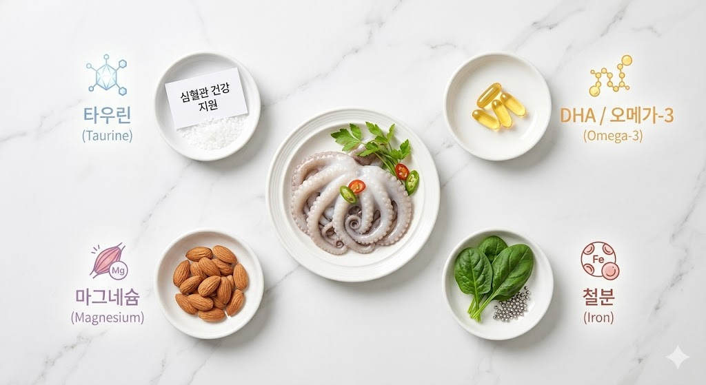 국립수산과학원 성분표에 따르면, 주꾸미 100g에는 1,597mg의 타우린이 들어 있습니다. 이는 낙지의 2배, 문어의 4배, 오징어의 5배에 달하는 수치입니다. 타우린은 피로회복제의 주성분으로, 간 기능 개선과 신경 안정에 도움을 줍니다.